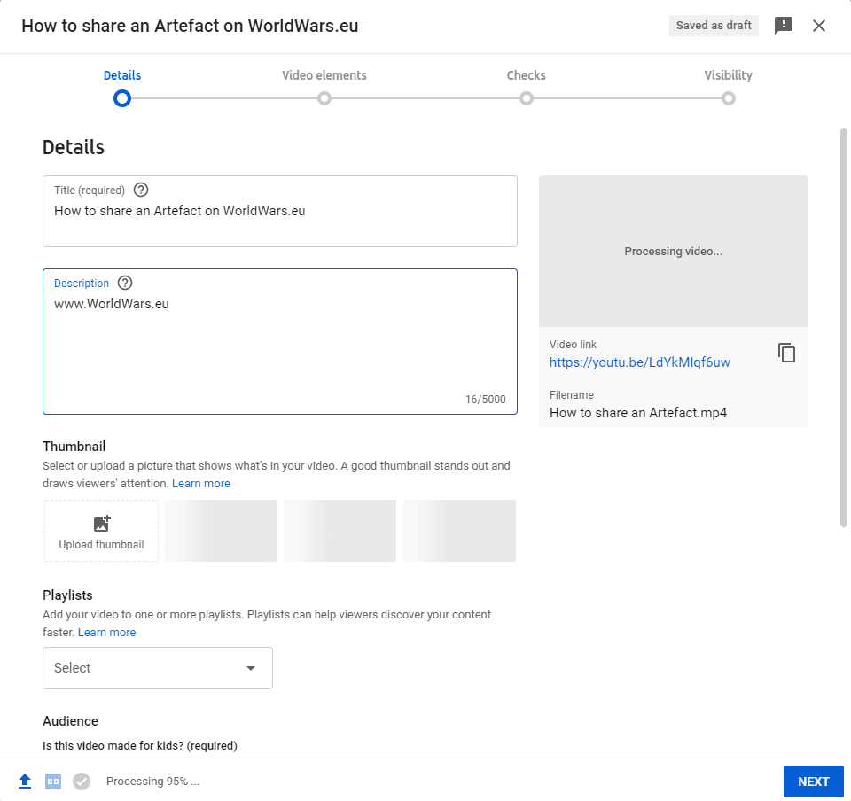 - Κάντε κλικ στο 'Next' (Επόμενο) στην κάτω δεξιά γωνία για να μεταβείτε στη σελίδα 'Visibility' (Ορατότητα). Εδώ μπορείτε να επιλέξετε να δημοσιεύσετε τα βίντεο 'Ιδιωτικά' (private), 'Μη καταχωρημένα' (unlisted) ή Δημόσια (public). Το βίντεό σας πρέπει να έχει οριστεί ως Δημόσιο ή Μη καταχωρημένο για να μπορέσετε να το προσθέσετε στο Αρχείο σας στο AceCulture.eu. Τα "Δημόσια" βίντεο μπορούν να αναζητηθούν μέσω της γραμμής αναζήτησης του YouTube. Τα "Μη καταχωρημένα" δεν μπορούν να αναζητηθούν και μπορούν να τα δουν μόνο όσοι έχουν τη διεύθυνση URL ή το βλέπουν στο AceCulture.eu.