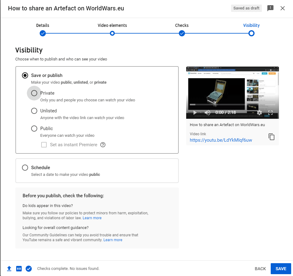 - Clique em 'Avançar' no canto inferior direito para aceder à página 'Visibilidade'. Aqui pode optar por publicar os vídeos em 'Privado', vídeos 'Não-listados' ou 'Públicos'. O seu vídeo deve estar definido como 'Público' ou 'Não-listado' para poder adicioná-lo ao seu Artefacto em AceCulture.eu. Os vídeos 'públicos' podem ser pesquisados através da barra de pesquisa do YouTube, os 'Não-listados' não são pesquisáveis e só podem ser visualizados por alguém que tenha o URL ou o visualize em AceCulture.eu